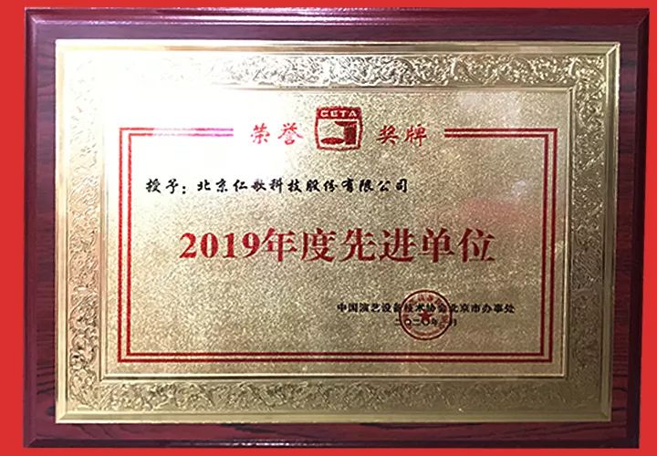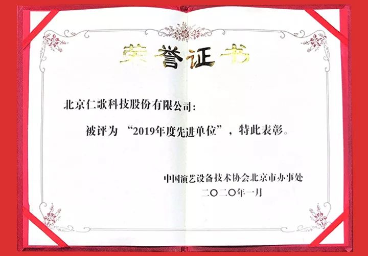 中國(guó)演藝設(shè)備技術(shù)協(xié)會(huì)北京辦事處授予北京仁歌科技股份有限公司“2019年度先進(jìn)單位”并頒發(fā)授牌及證書