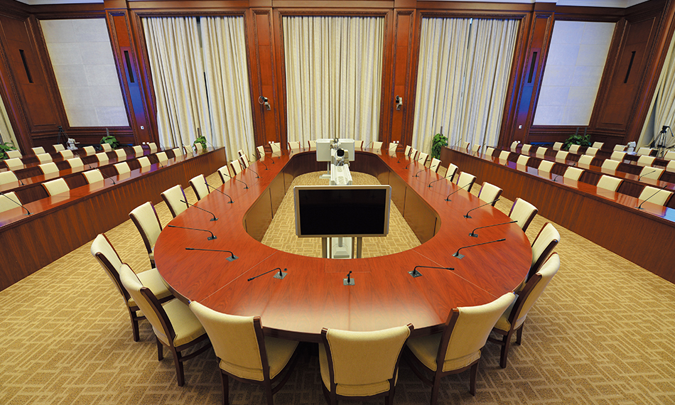 仁歌承接了數字會議系統的建設。包括3間大型會議室、5間中型會議室、12間小型會議室。會議室具備音視頻信號演示、會標顯示、3D+4K電影放映、同聲傳譯等功能。系統設計上,采用音頻系統雙備份的方式,在輸入輸出接口機、音頻矩陣、音頻網絡、功率放大器四方面互為備份;視頻方面,采用了廣播級高清攝像機,可以采集具有高清晰度的視頻圖像,采集的信號進行兩路同時傳遞,以保障系統穩定、可靠、安全運行。此外,整個系統采用集中控制,在總控制室可以分別控制和調度各會議室的音視頻信號和各會議室燈光系統,各會議室集中控制系統組網連接,方便操作人員使用。