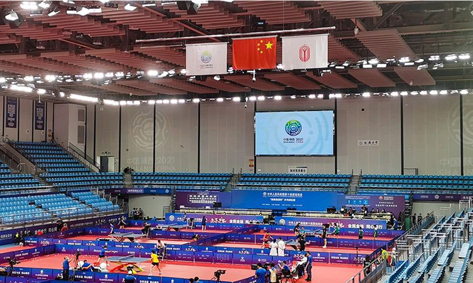 第十四屆全運會在陜西西安開幕,仁歌股份承接了乒乓球賽事場館項目設備設施,乒乓球比賽項目主場館在延安大學體育中心舉行,主擴采用的是仁歌股份自主品牌Ditop-best(迪拓)雙8寸線陣列揚聲器,69只全頻線陣列揚聲器,以分散式布局方式均勻覆蓋場館觀眾席,聲音通透嘹亮,更采用特有的空間升學處理方式,解決了場館混響時間過長的問題,大幅度提高了觀眾席區域的語言清晰度,滿足了高標準的賽事要求,我們專業的技術團隊,為全運會乒乓球賽館保駕護航。